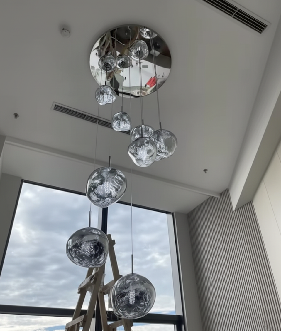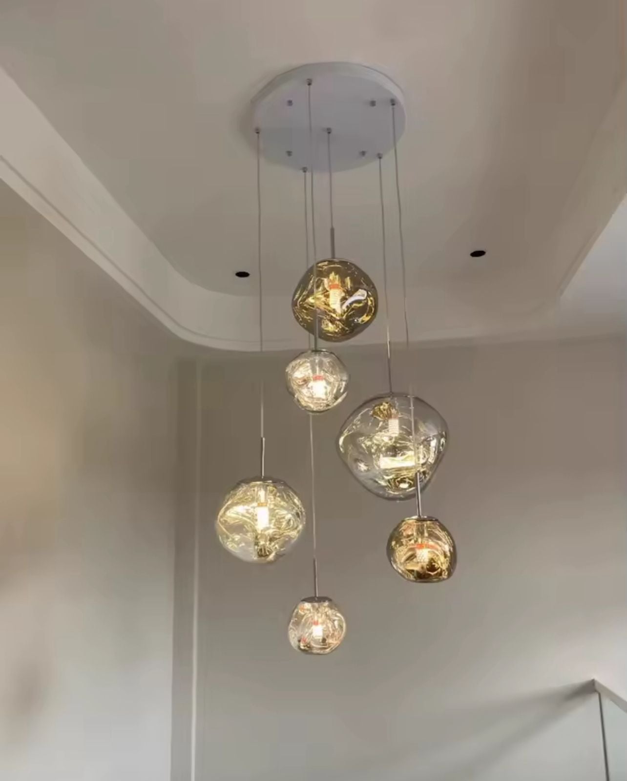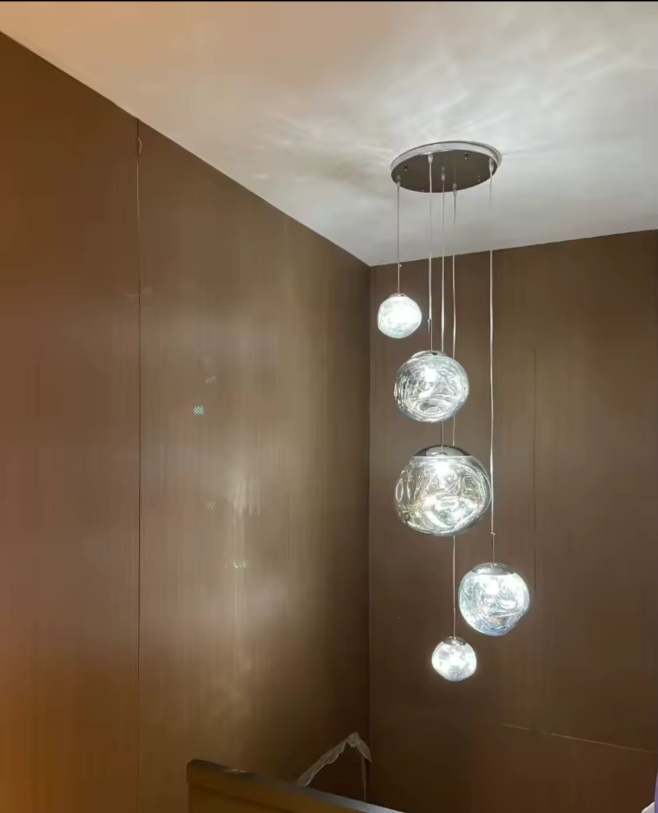 Inspirada en la estrella del norte, esta luminaria en cascada de esferas de cristal refleja movimiento, brillo y sofisticación. Su diseño suspendido aporta un efecto escultórico que llena de carácter vestíbulos, escaleras o cualquier espacio.