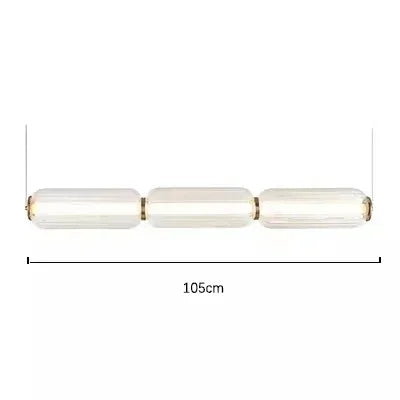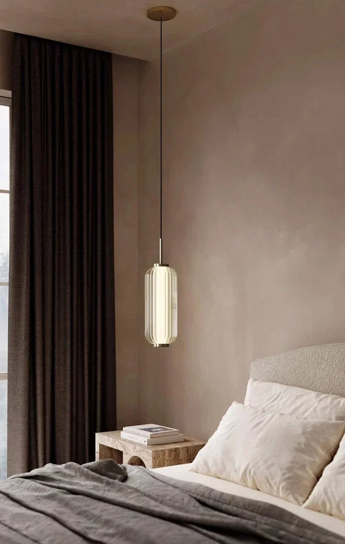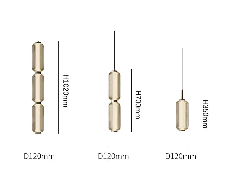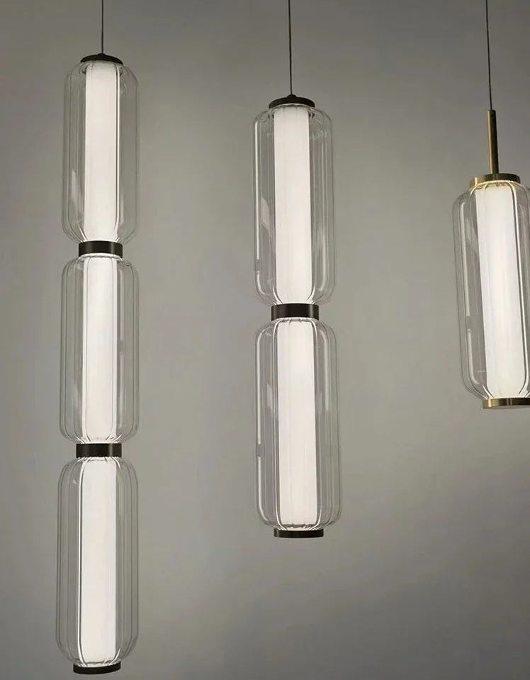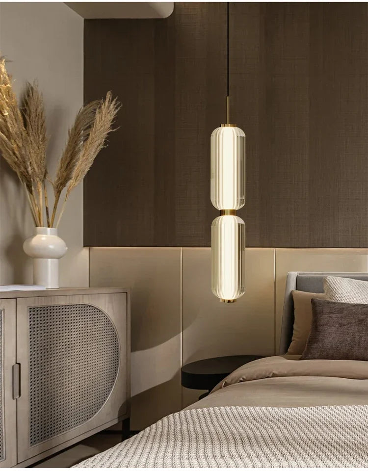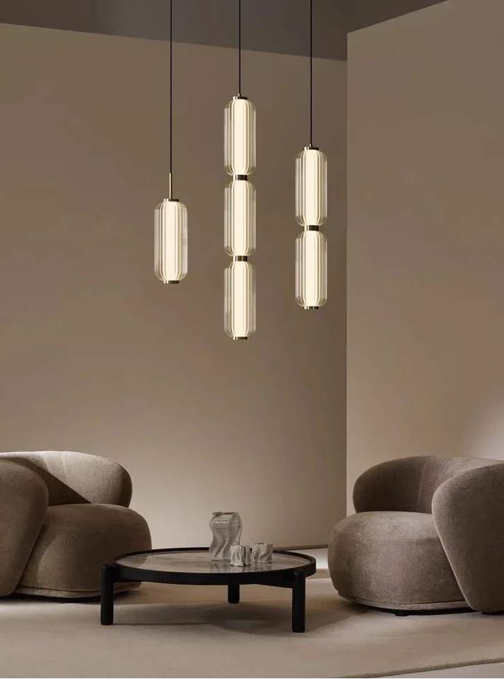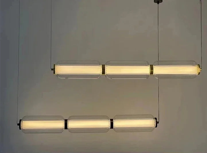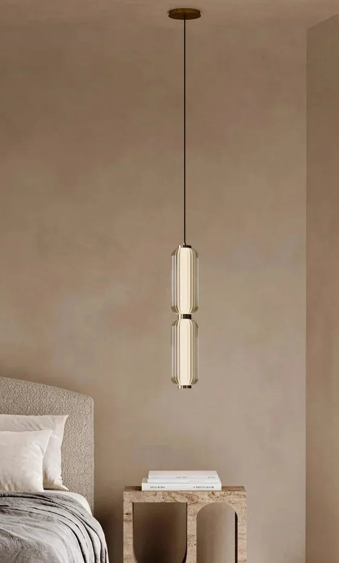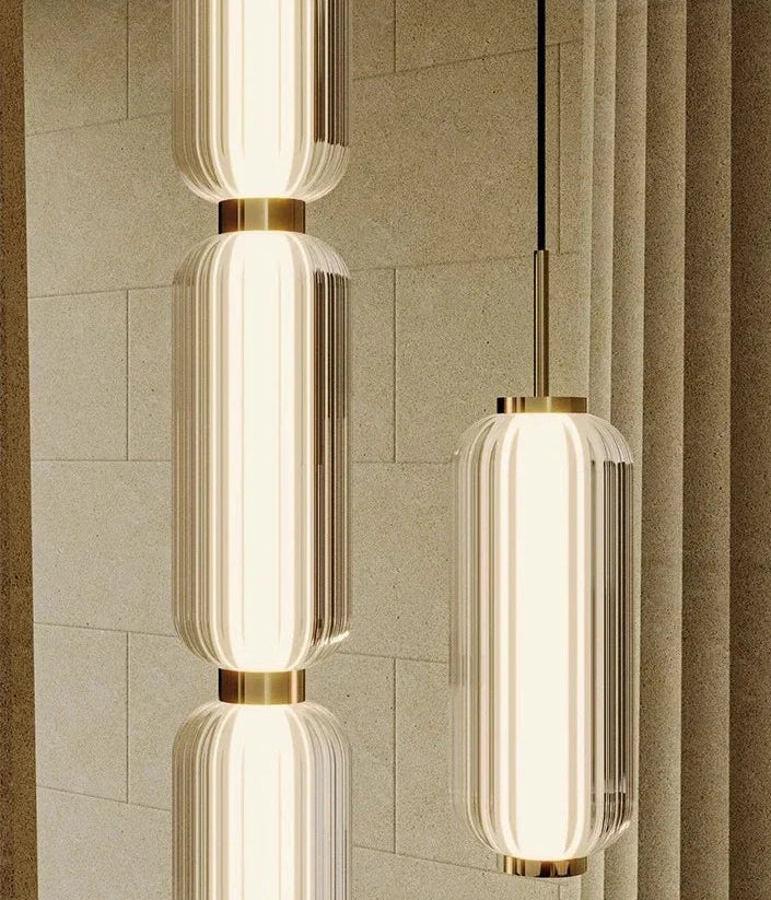 La lámpara colgante Lunea redefine el concepto de iluminación decorativa con su diseño esbelto y contemporáneo. Su estructura está compuesta por dos cilindros de vidrio óptico tallado unidos por delicados acentos metálicos en acabado dorado espejo, creando un equilibrio perfecto entre modernidad y calidez.