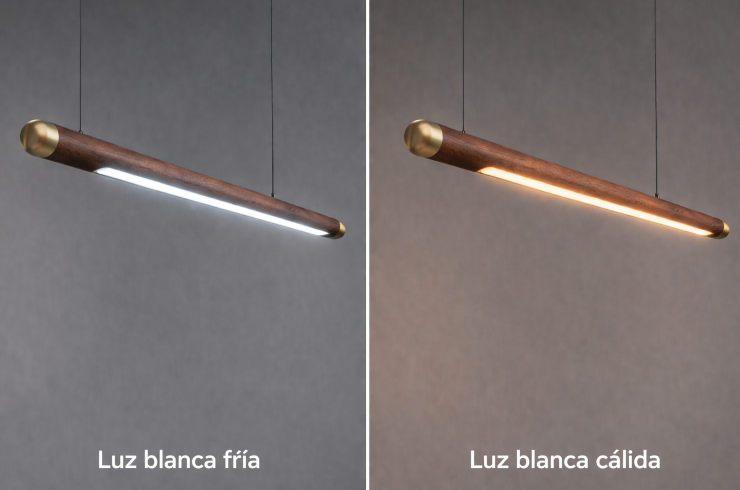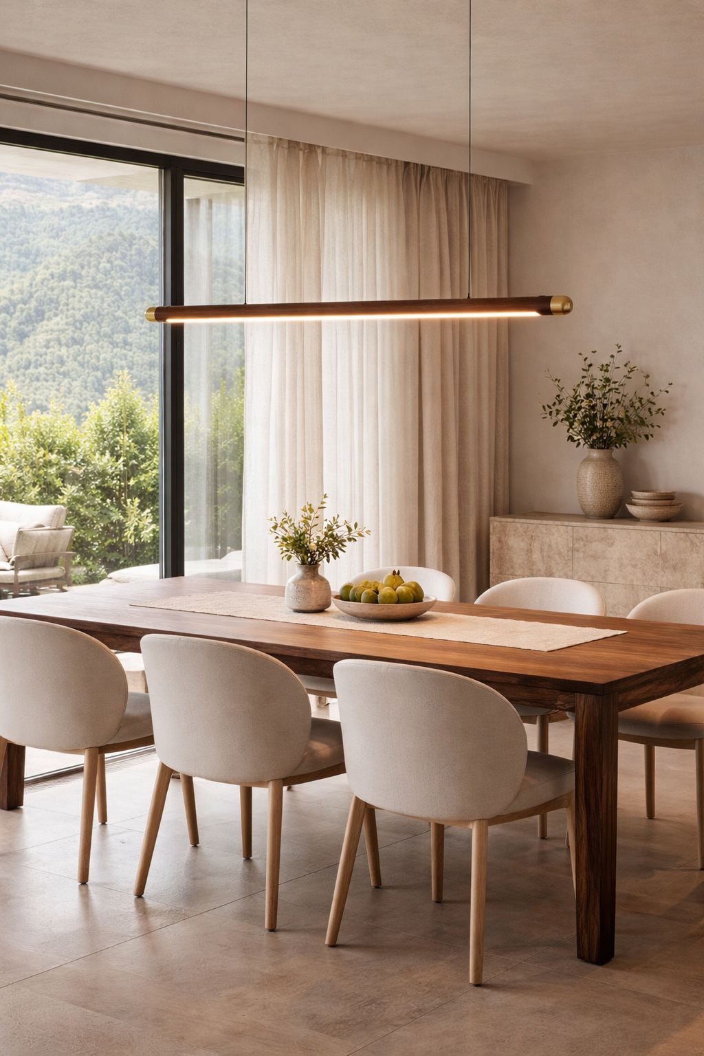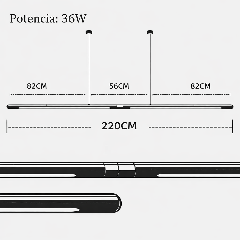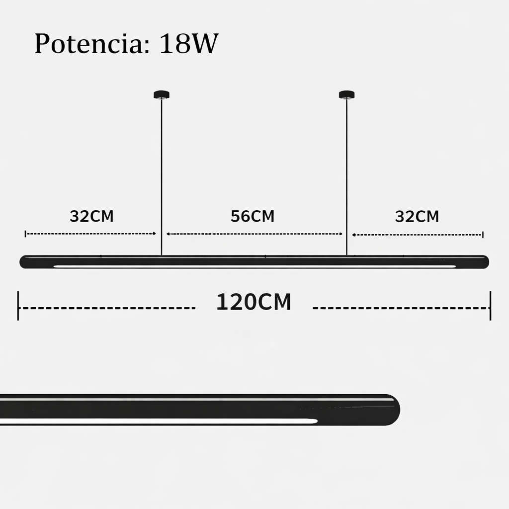 Su diseño limpio y suspendido integra la luz de forma sutil, proyectando una iluminación cálida y envolvente que da vida al espacio sin saturarlo.