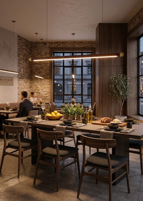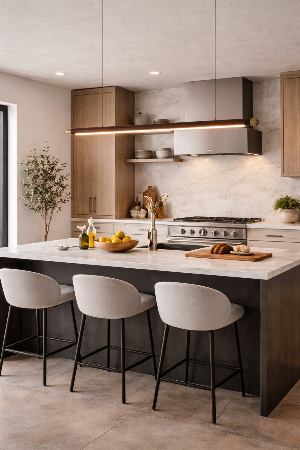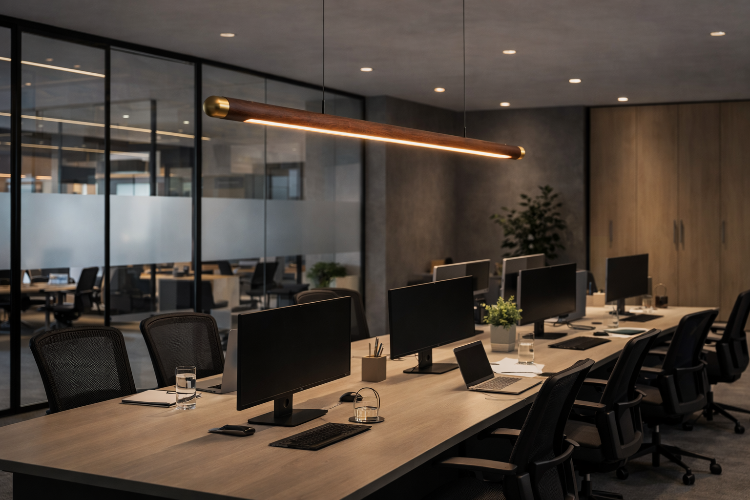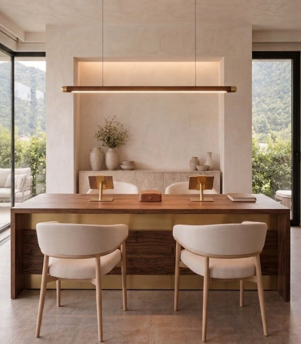 Su diseño limpio y suspendido integra la luz de forma sutil, proyectando una iluminación cálida y envolvente que da vida al espacio sin saturarlo.